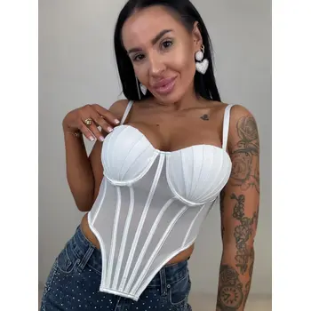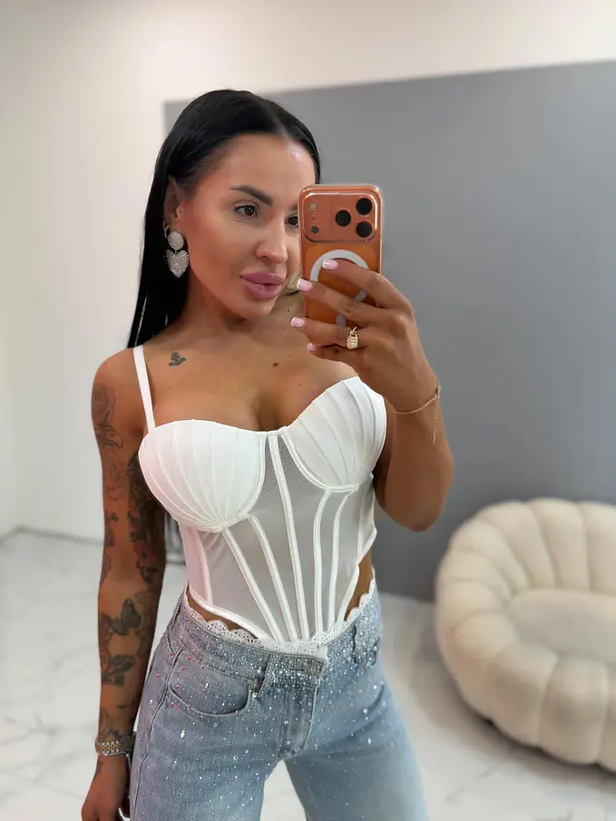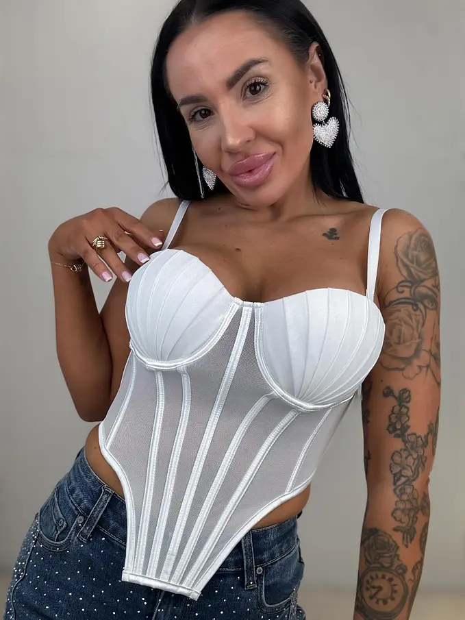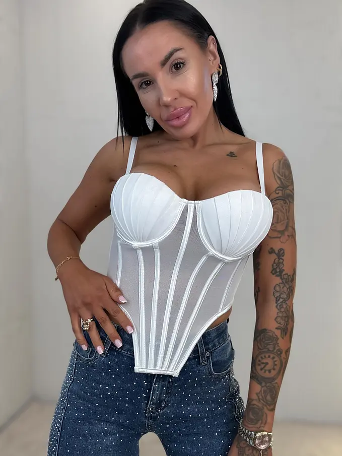 Modelka čiernovláska meria 164 cm a váži 57 kg. Nosí veľkosť S/M.