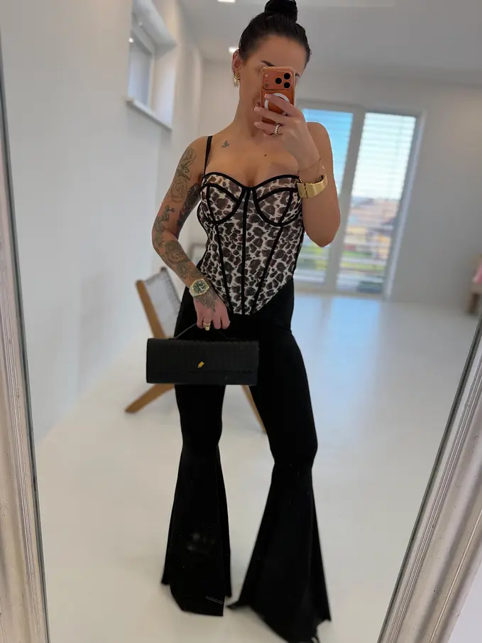 Modelka meria 164 cm a váži 57 kg. Má na sebe veľkosť S/M.