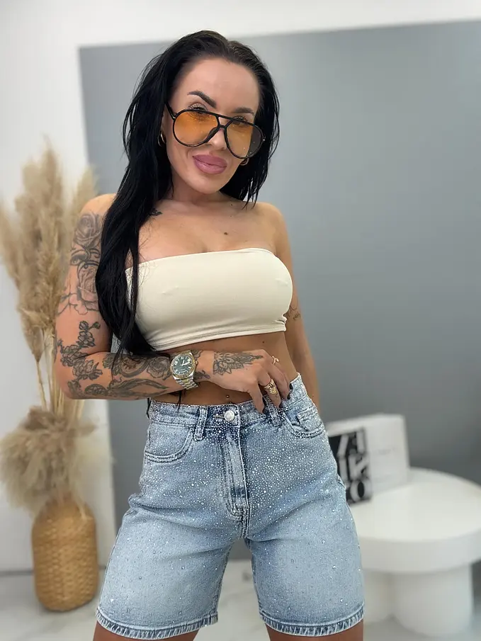 Tieto moderné a štýlové rifľové šortky spájajú čistý dizajn s výraznými detailmi. Starostlivo osadené, odolné kamienky dodávajú jedinečný, trblietavý vzhľad, zatiaľ čo klasický denim materiál zaručuje pohodlné nosenie počas celého dňa.