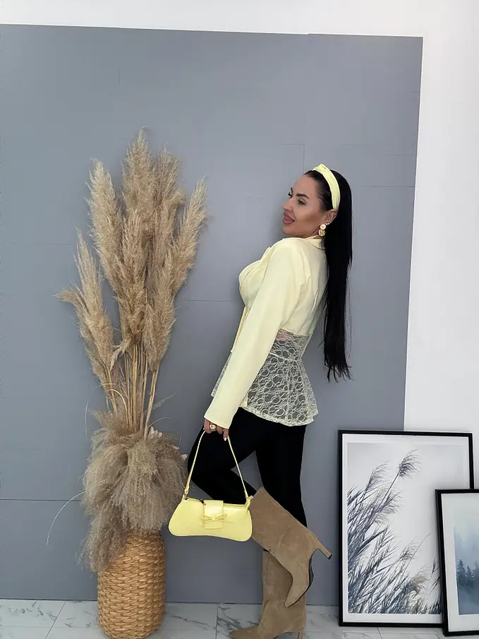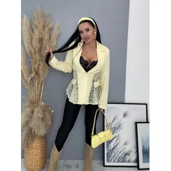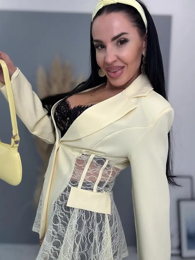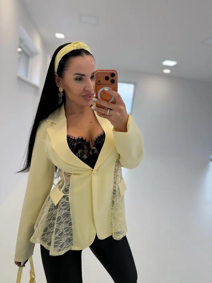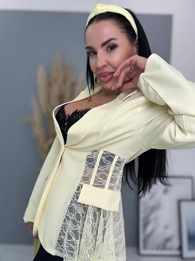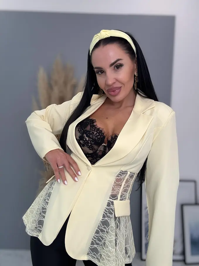 Dámske sako z príjemného materiálu. Materiál nie je elastický. Sako sa zapína na gombík. Má vypchávky v oblasti ramien. Priehľadnými čipkovými vsadkami. Sako je podšité.