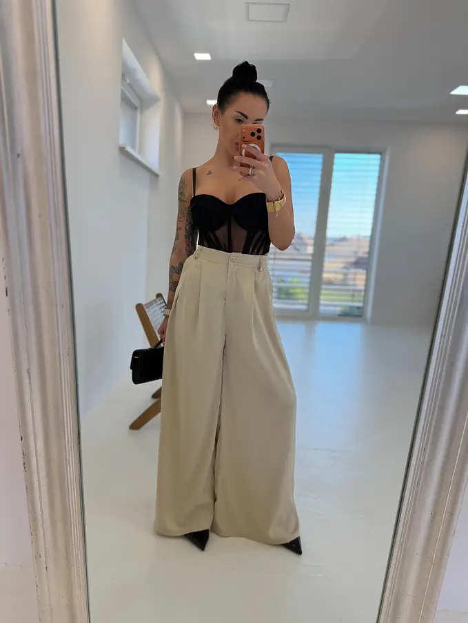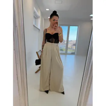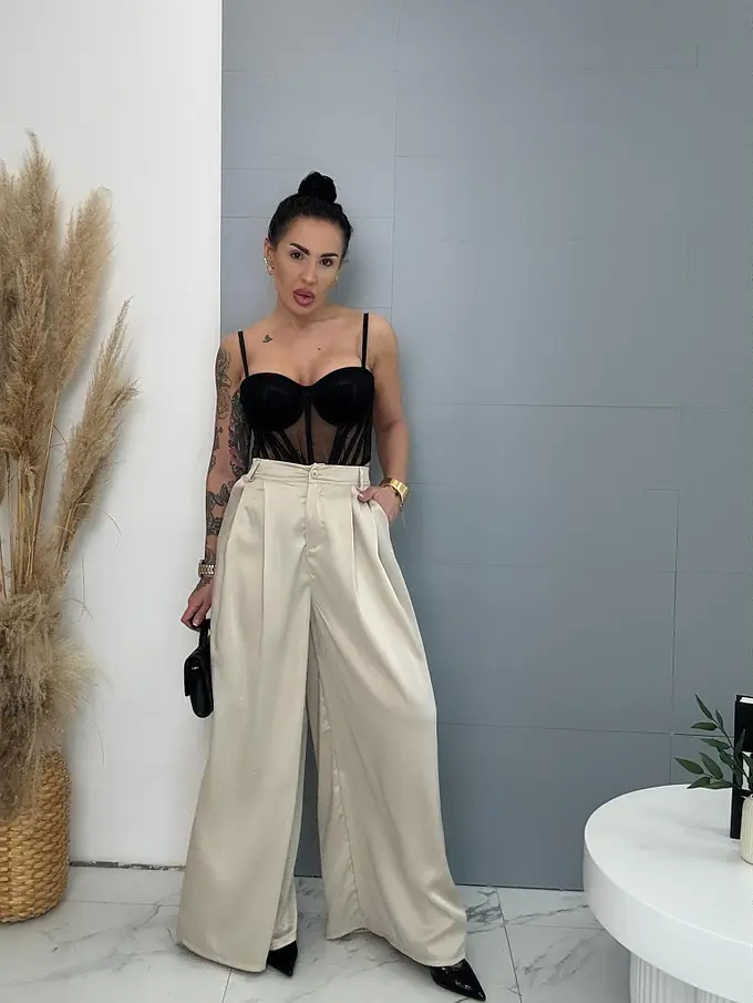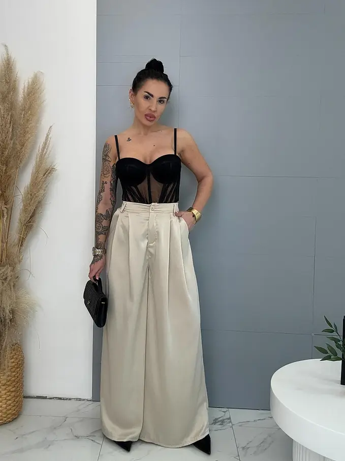 Ľahké saténové nohavice z kvalitného materiálu v modernom širokom strihu. Model so širokými nohavicami, vysokým pásom, elastickým pásom pre pohodlie a praktickými bočnými vreckami.