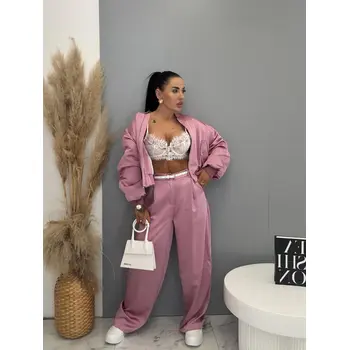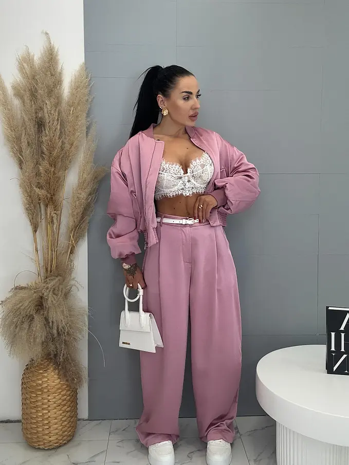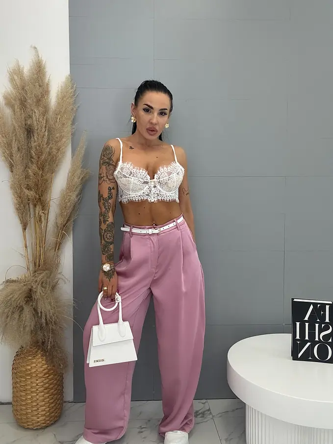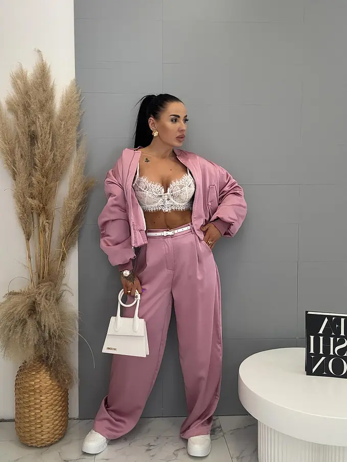 Ponúkame elegantné dámske nohavice, tento model spája luxusný štýl s pohodlným nosením — materiál je príjemný na dotyk a jemne sa leskne, čo zvyšuje prestíž každého outfitu. Široké nohavice a vysoký pás opticky predlžujú postavu, zatiaľ čo dekoratívne záhyby pridávajú originalitu a ľahkosť. Praktickými bočnými vreckami. Ideálna voľba do kancelárie, na špeciálne udalosti aj každodenné nosenie.