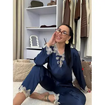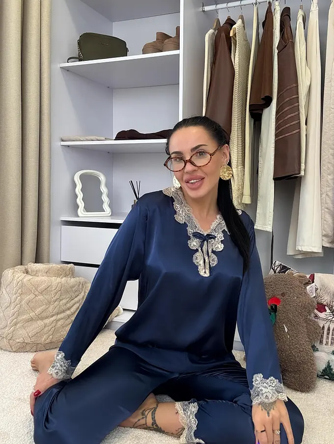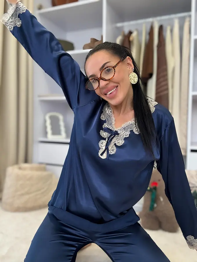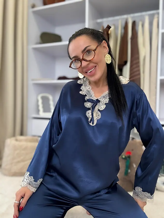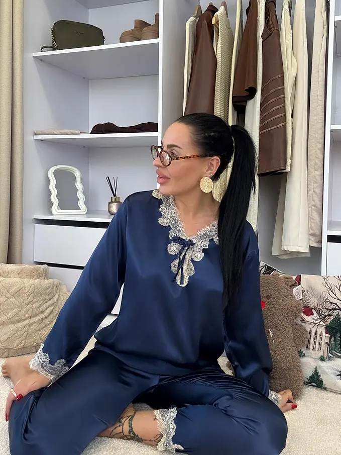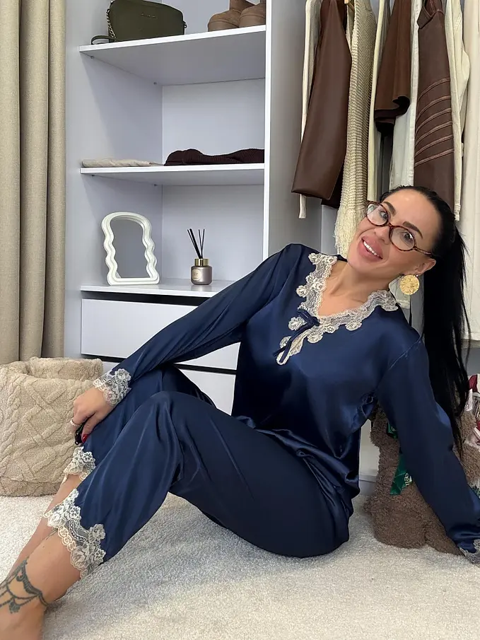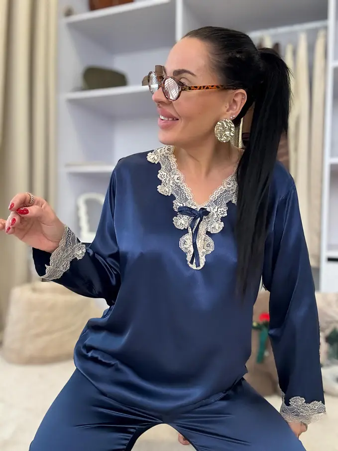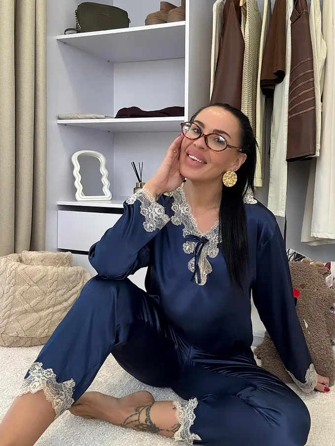 Saténové pyžamo s čipkovým lemom. Látka nie je elastická. Nohavice majú gumený pás. Horná časť je zdobená čipkou.