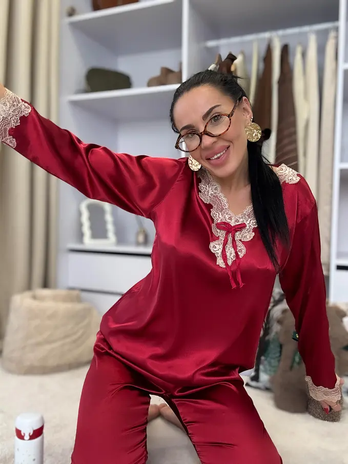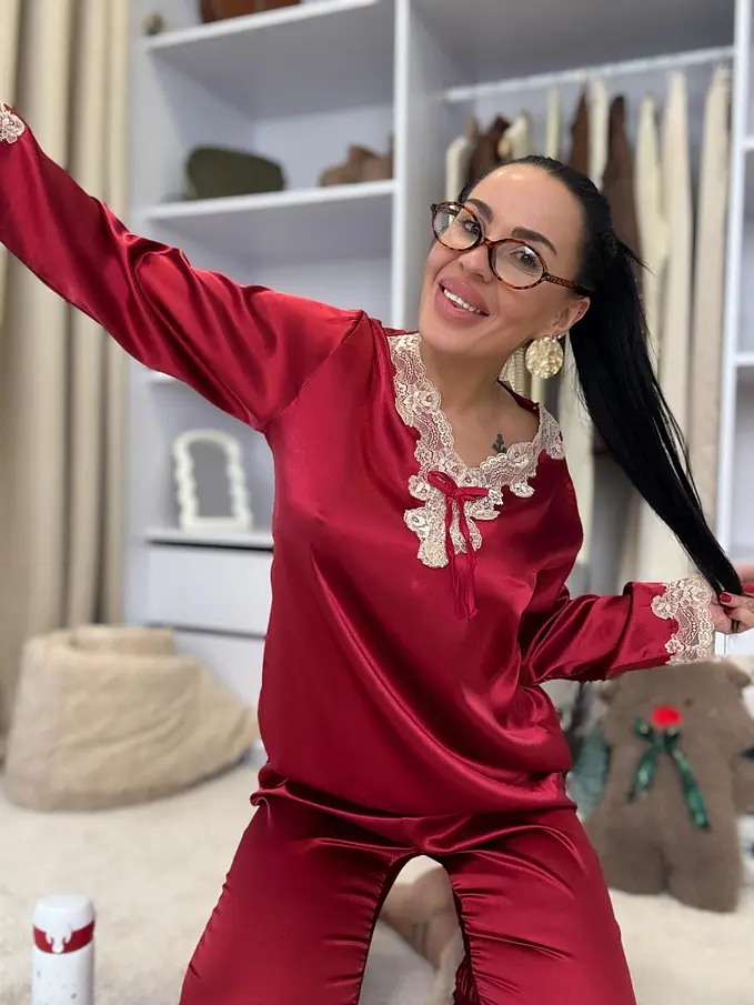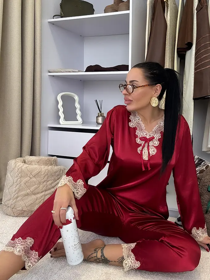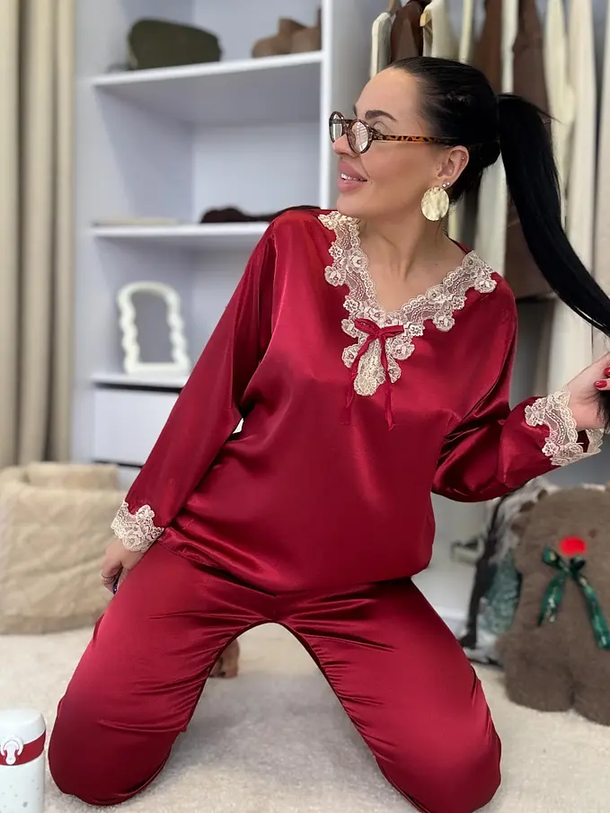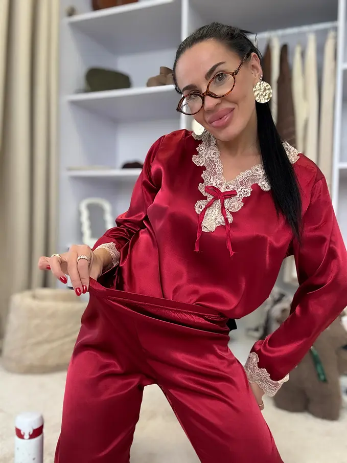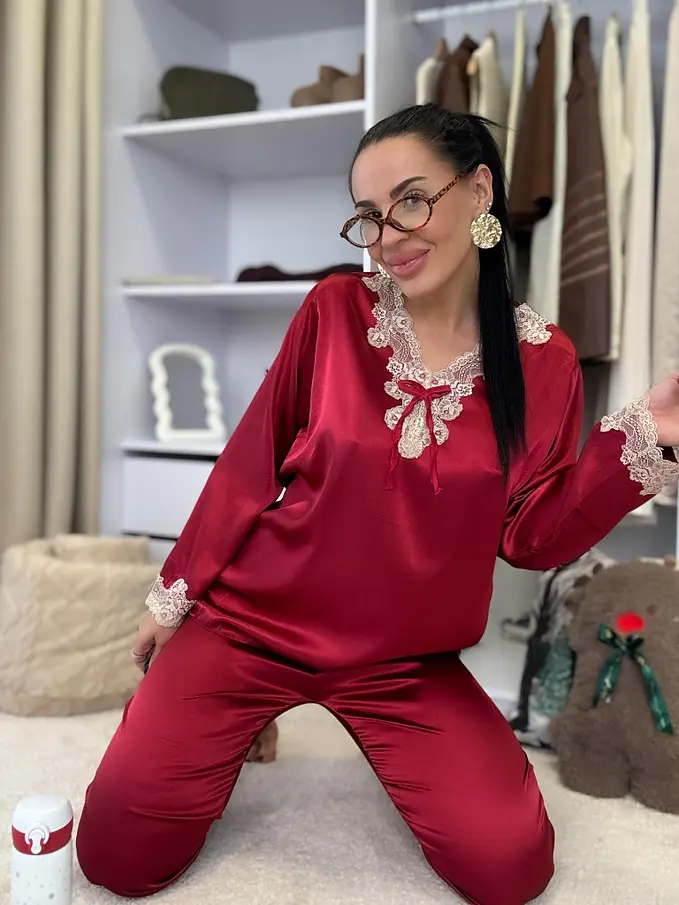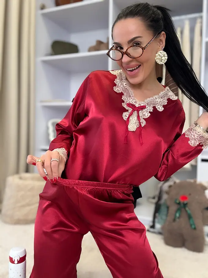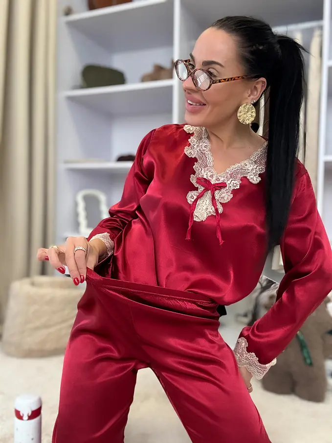 Saténové pyžamo s čipkovým lemom. Látka nie je elastická. Nohavice majú gumený pás. Horná časť je zdobená čipkou.