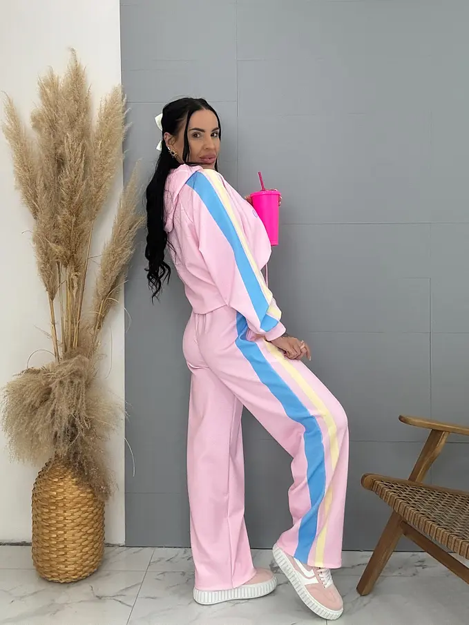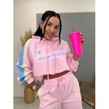 Dámsky komplet z novej kolekcie. Pozostáva z mikiny a nohavíc. Nohavice majú gumený pás. Materiál je príjemný, elastický.