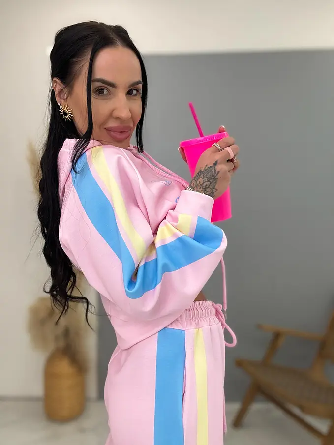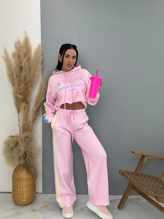 Dámsky komplet z novej kolekcie. Pozostáva z mikiny a nohavíc. Nohavice majú gumený pás. Materiál je príjemný, elastický.