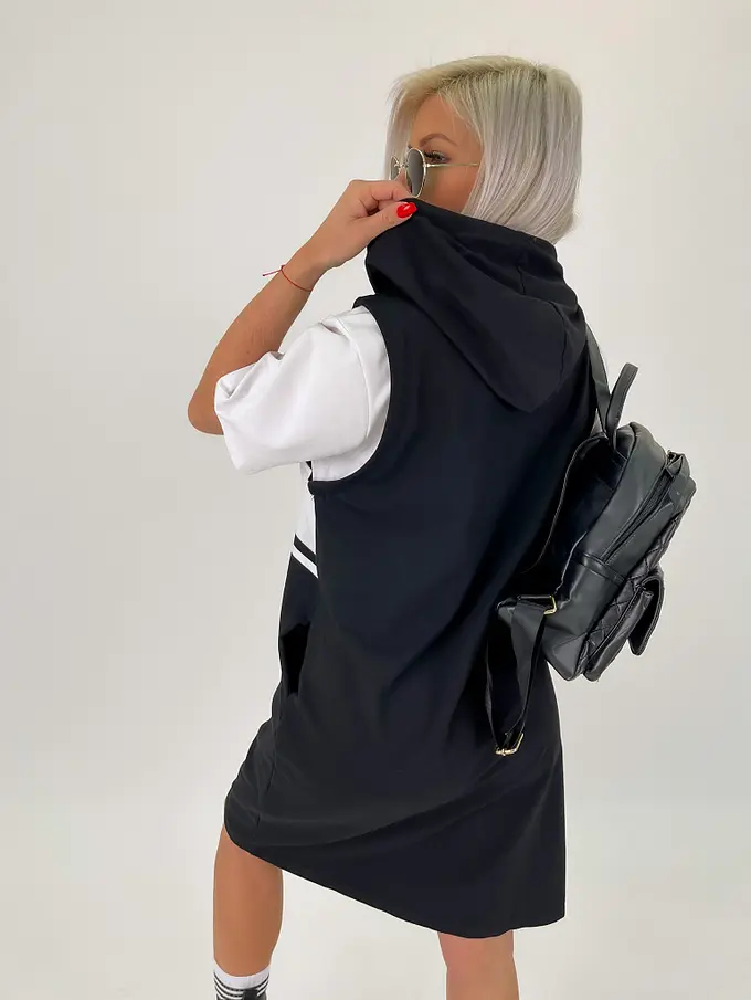 Modelka meria 165 cm a váží 55 kg. Nosí veľkosť S/M.