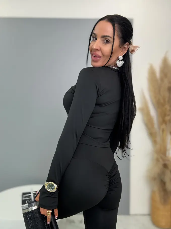 Módny komplet pre extravagantné ženy. Priamo z Francúzka. Set pozostáva z trička s dlhým rukávom a legíny s tvarovaným zadkom. Materiál je elastický. Nohavice majú gumený pás.