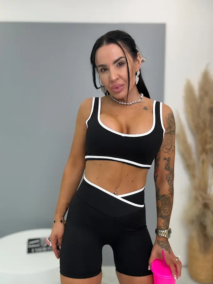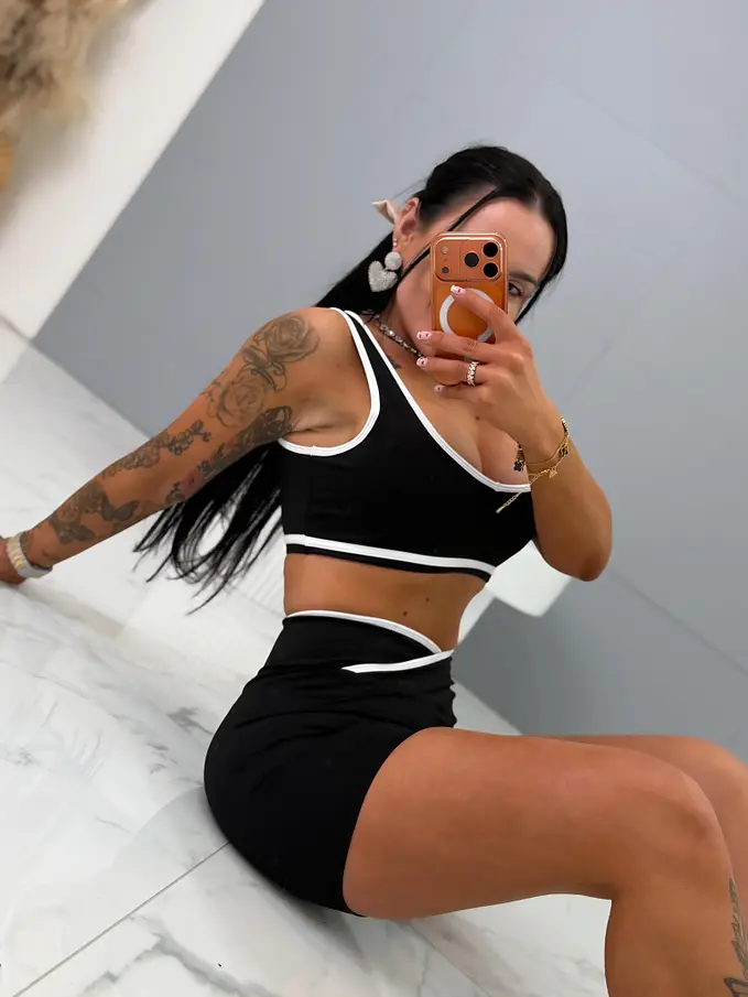 Módny komplet pre extravagantné ženy. Set pozostáva z crop-topu a šotky. Materiál je elastický, nepriehľadný, kvalitný, ktorý zakrýva nedostatky pokožky. Nohavice majú gumený pás.
