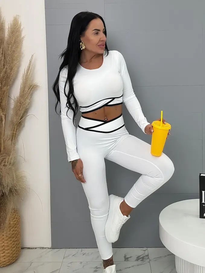 Módny komplet pre extravagantné ženy. Set pozostáva z dlhého rukávu crop-topu a legín. Materiál je elastický, nepriehľadný, kvalitný, ktorý zakrýva nedostatky pokožky. Nohavice majú gumený pás.