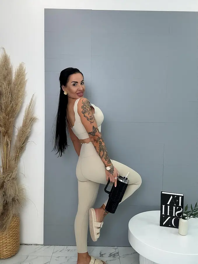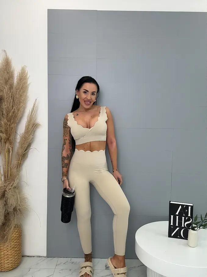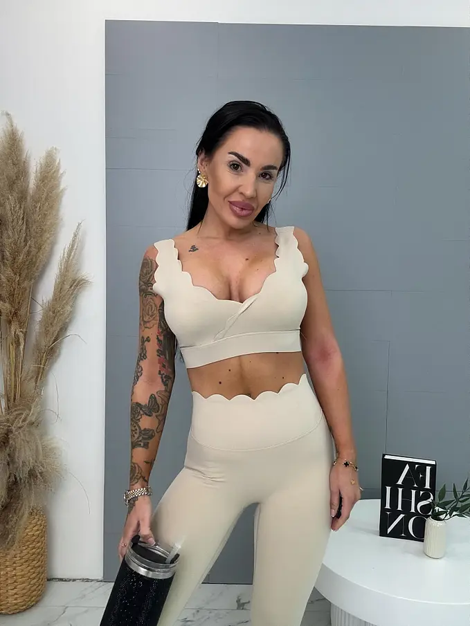 Módny komplet pre extravagantné ženy. Komplet sa pozozstáva z crop-topu a legíniek. Materiál je elastický, nepriehľadný, kvalitný, ktorý zakrýva nedostatky pokožky. Nohavice majú gumený pás. Crop top s vypchávkami na prsia.