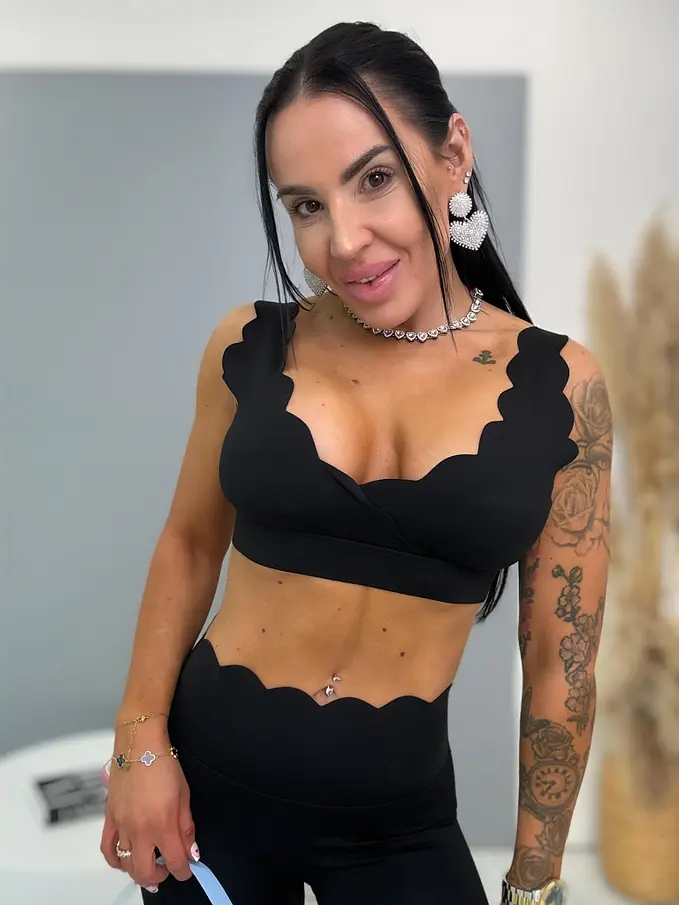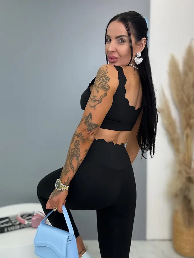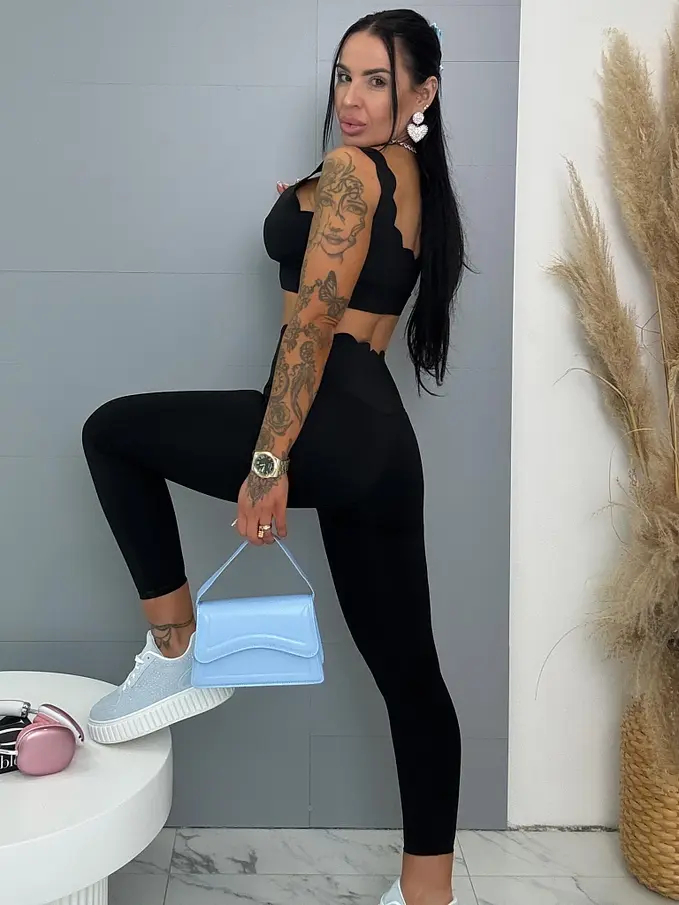 Módny komplet pre extravagantné ženy. Komplet sa pozozstáva z crop-topu a legíniek. Materiál je elastický, nepriehľadný, kvalitný, ktorý zakrýva nedostatky pokožky. Nohavice majú gumený pás. Crop top s vypchávkami na prsia.