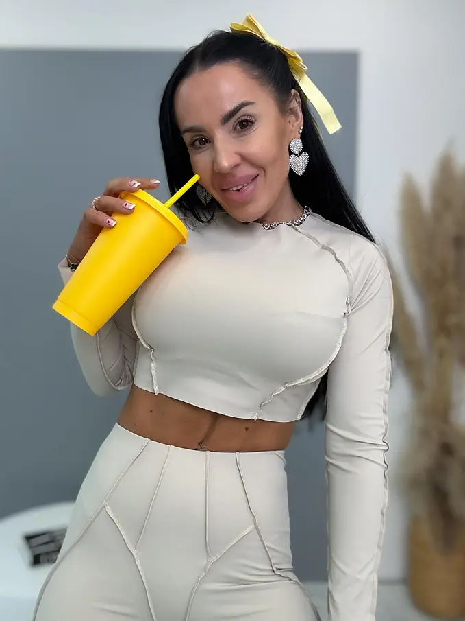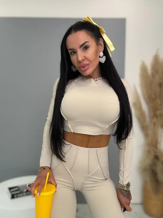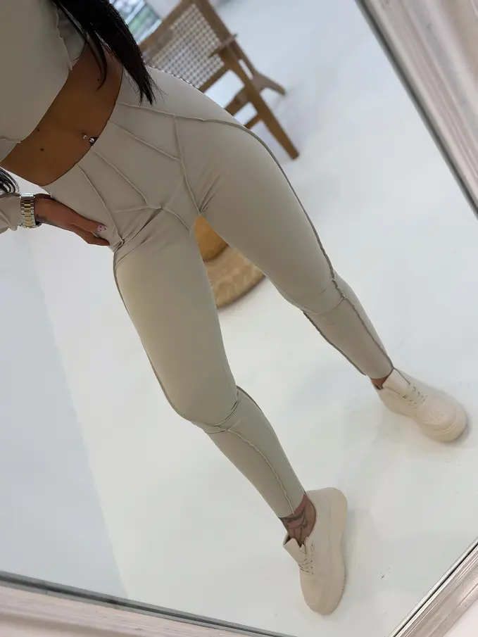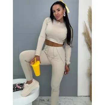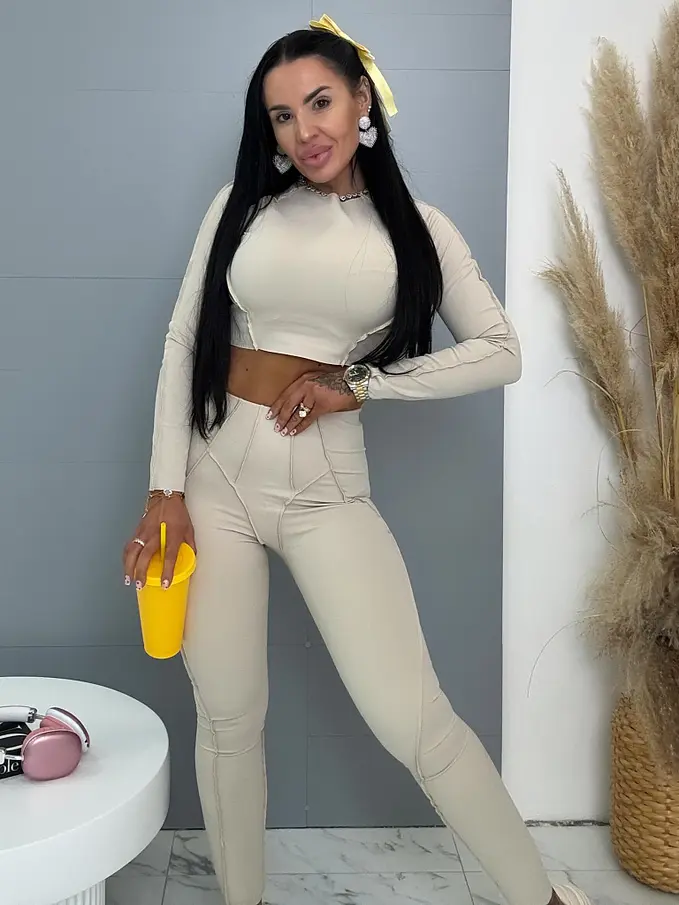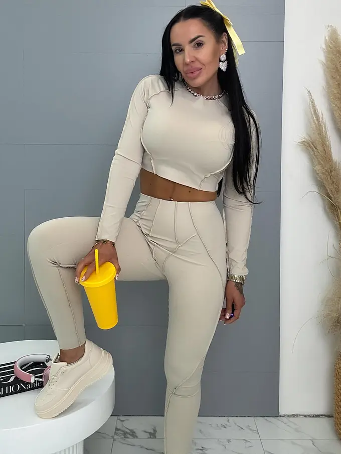Módny komplet pre extravagantné ženy. Komplet sa pozozstáva z crop-topu a legíniek. Materiál je elastický, nepriehľadný, kvalitný, ktorý zakrýva nedostatky pokožky. Nohavice majú gumený pás.