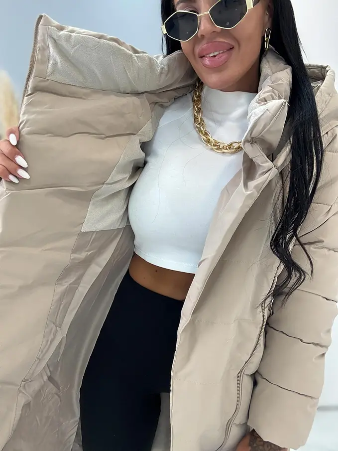 Bunda s odnimateľnou kapucňou. S bočnými vreckami. Ozdoba v zlatej farbe.