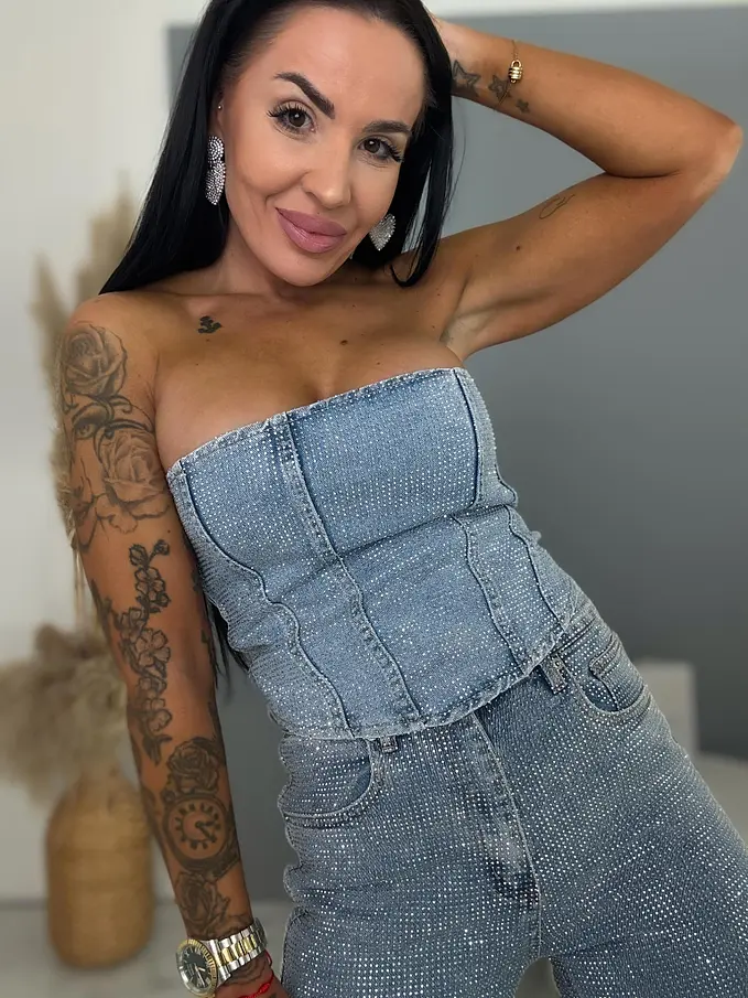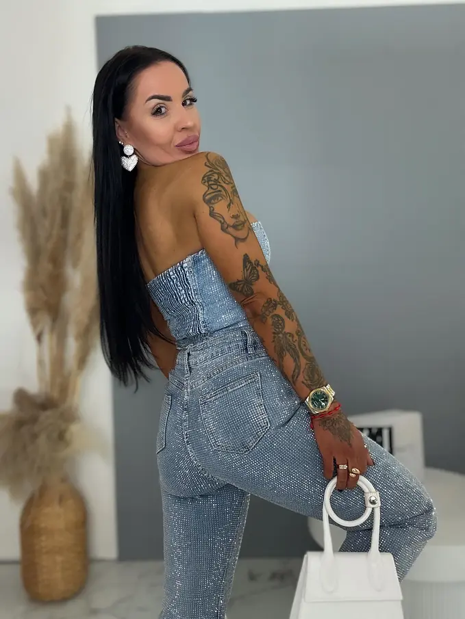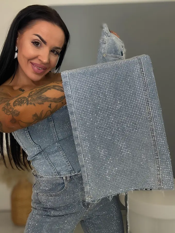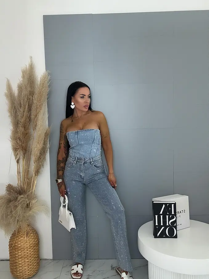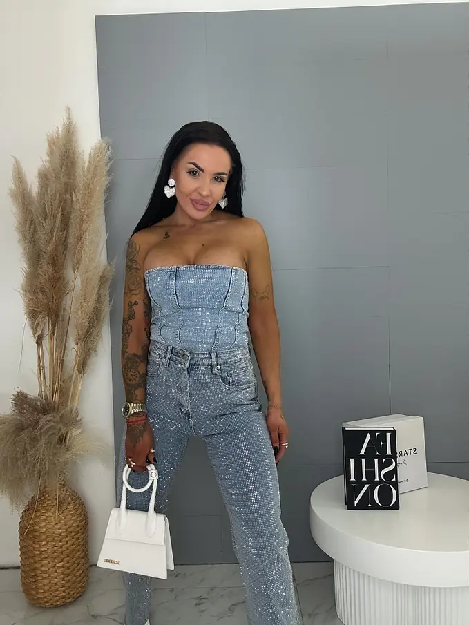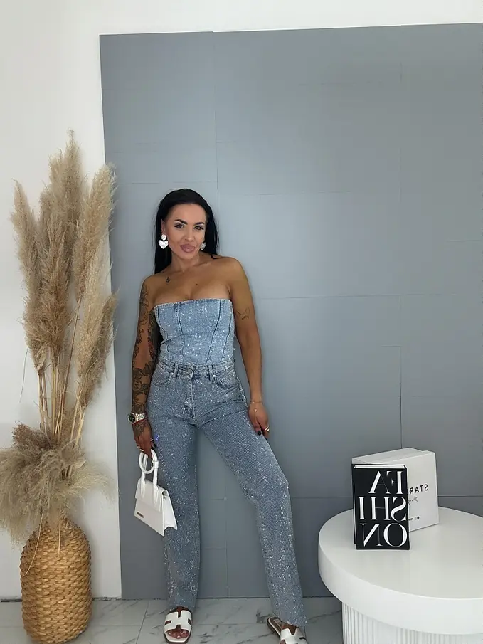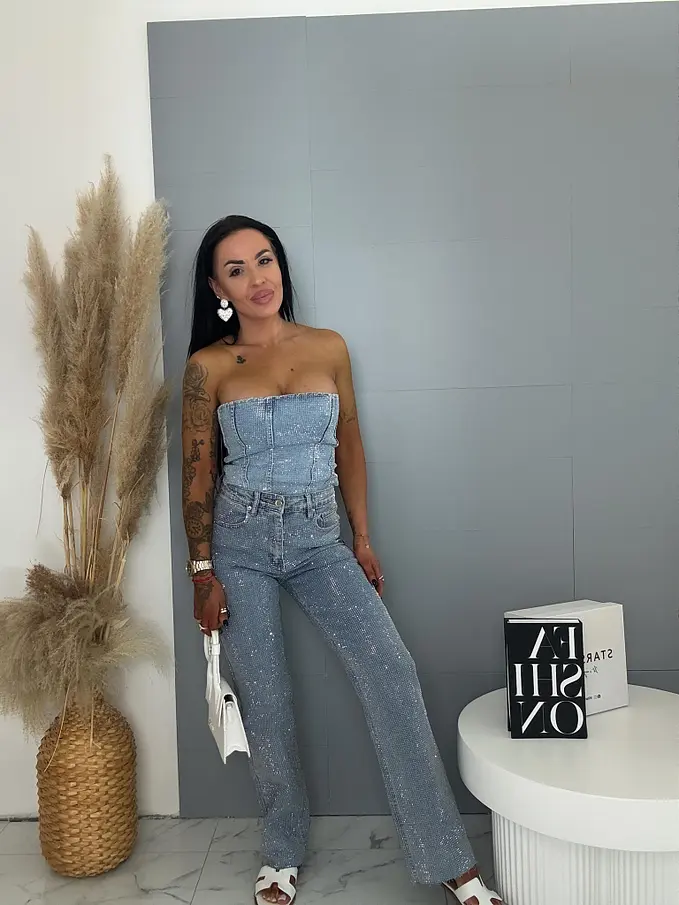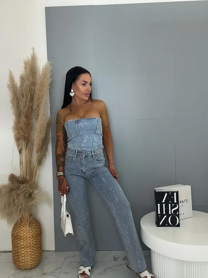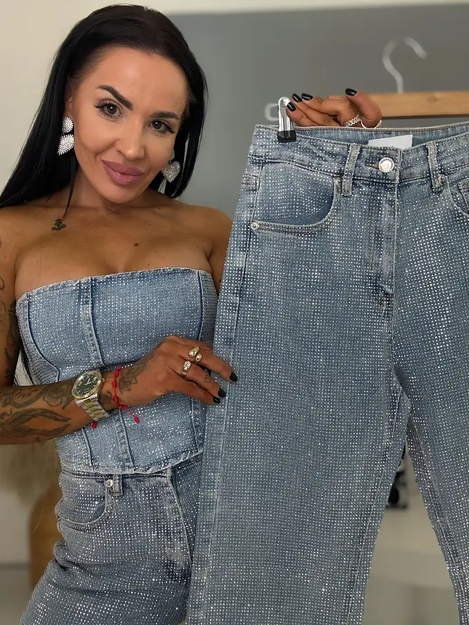 Moderné, pohodlné džínsy s voľným (wide leg) strihom, zdobené kamienkami a so strieborným predným gombíkom. Vpredu aj vzadu sú praktické vrecká. Spodná časť nohavíc nie je vyhrnutá.