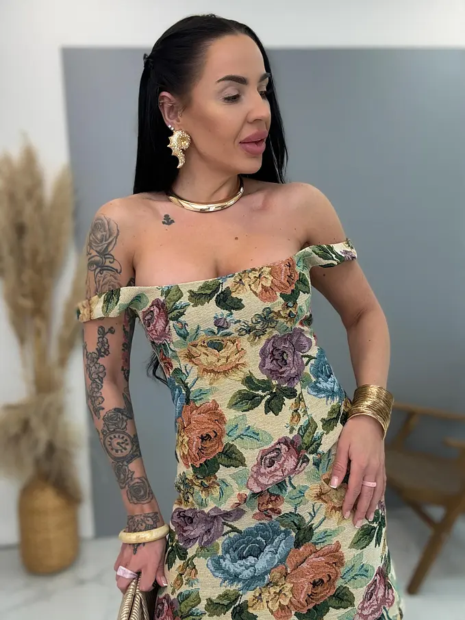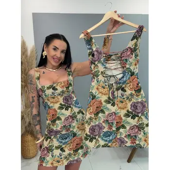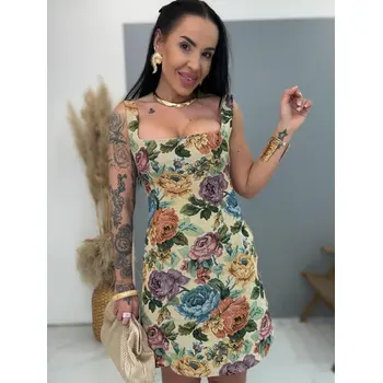 Štrukturované kvetované šaty so šnurovaním vzadu. Materiál nie je elastický. Podšitá so spodničkou.