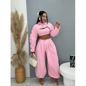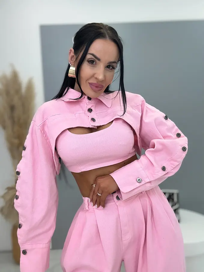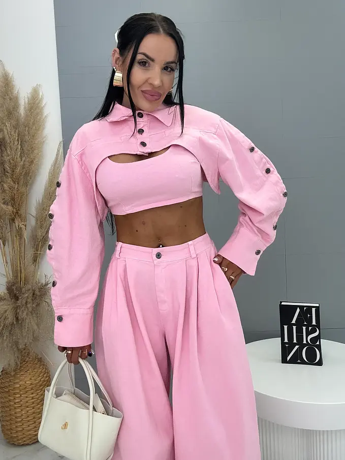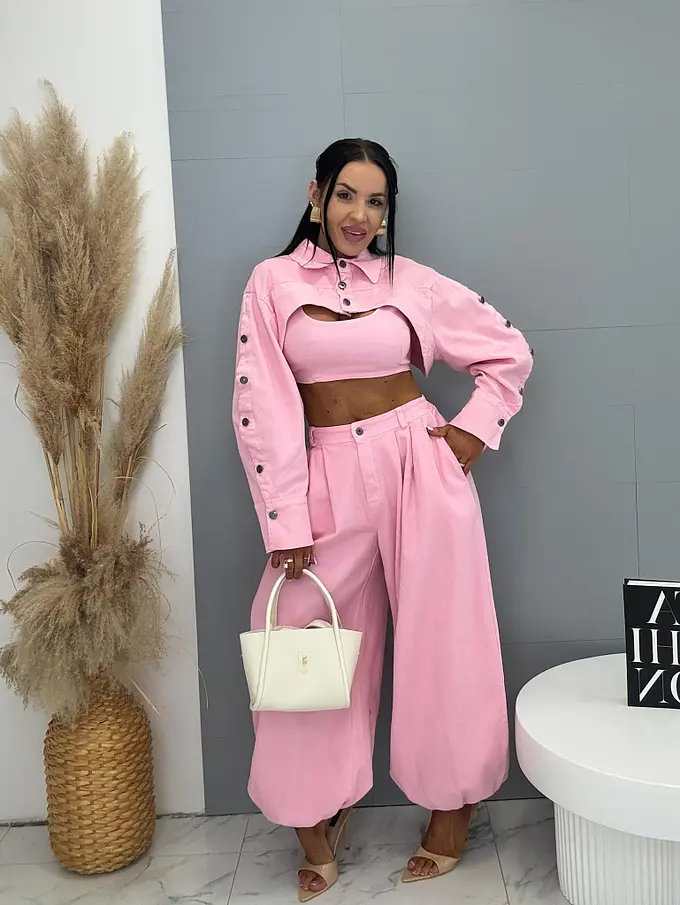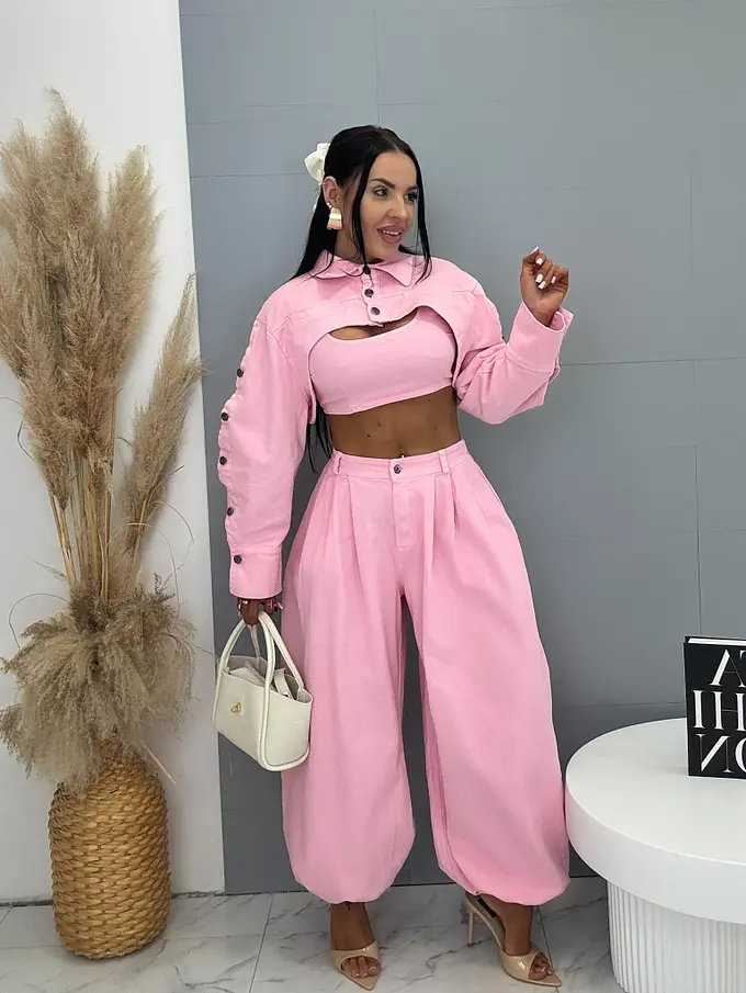 Trojdielny denim komplet priamo z Talianska, prémiová kvalita. Material je príjemne elastický. Set pozostáva z crop topu, bundy a nohavíc. Nohavice majú vysoký elastický pás, spodok zakončený gumou a praktické bočné vrecká. Crop top sa zapína na zips na chrbte. Krátka bunda so čierno-stribornými gombíkmi.