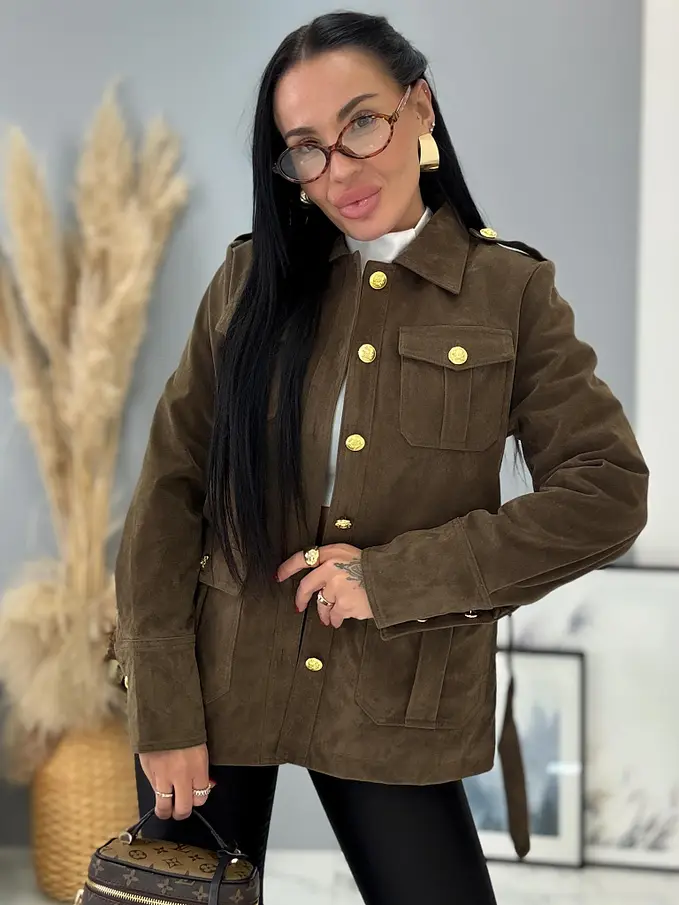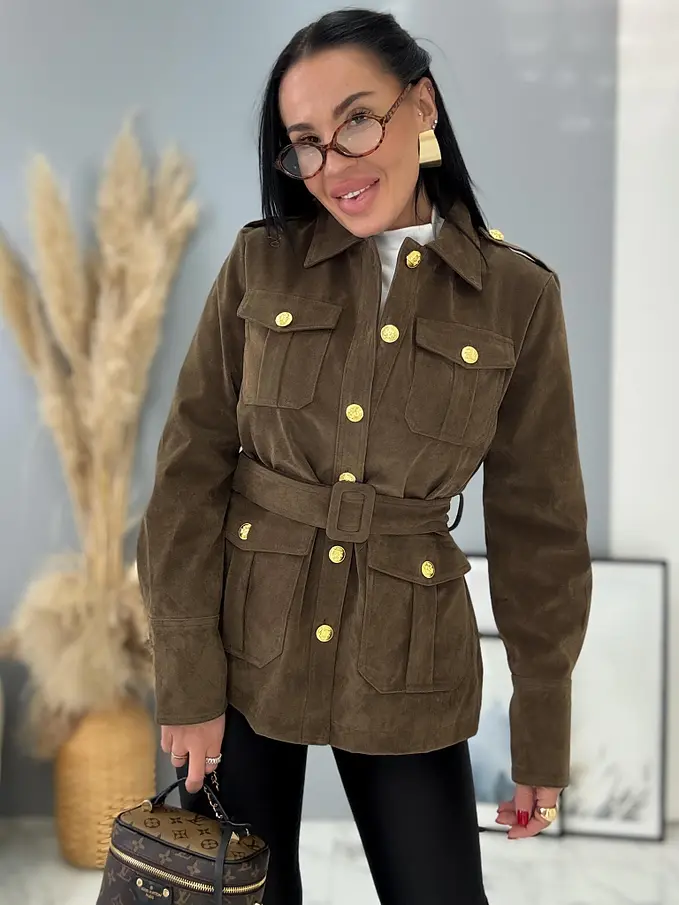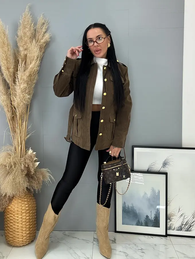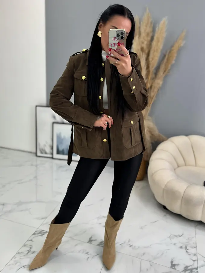 Bunda je vyrobený z príjemného materiálu. S prednými vreckami a opaskom. Gombíky v zlatej farbe.