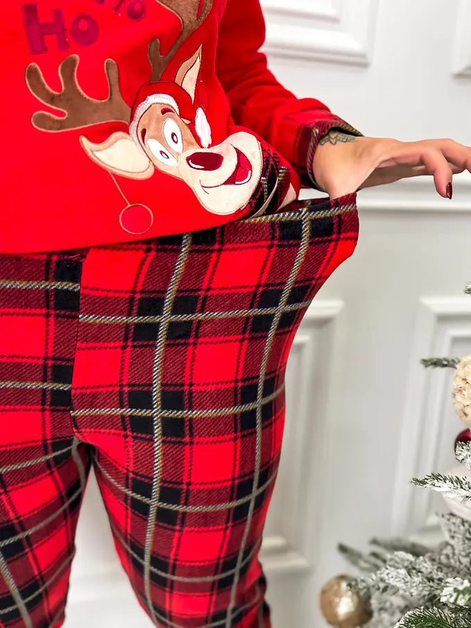 Pohodlné pyžamo z elastického dekového materiálu. Nohavice majú gumený pás. Modelky mali na sebe veľkosť M.
