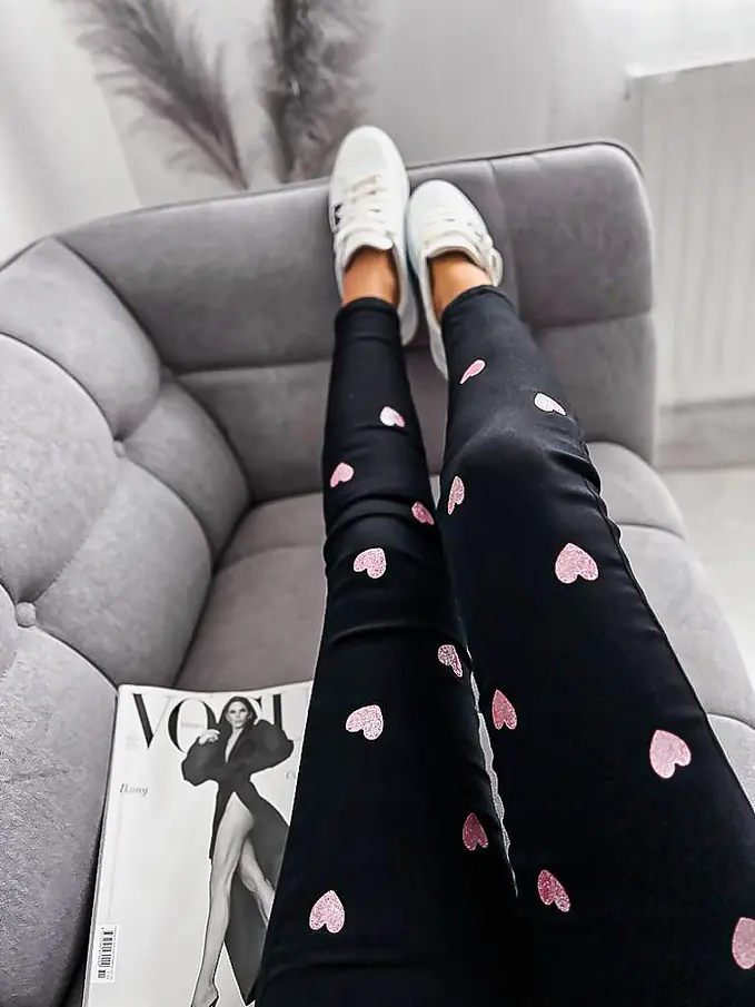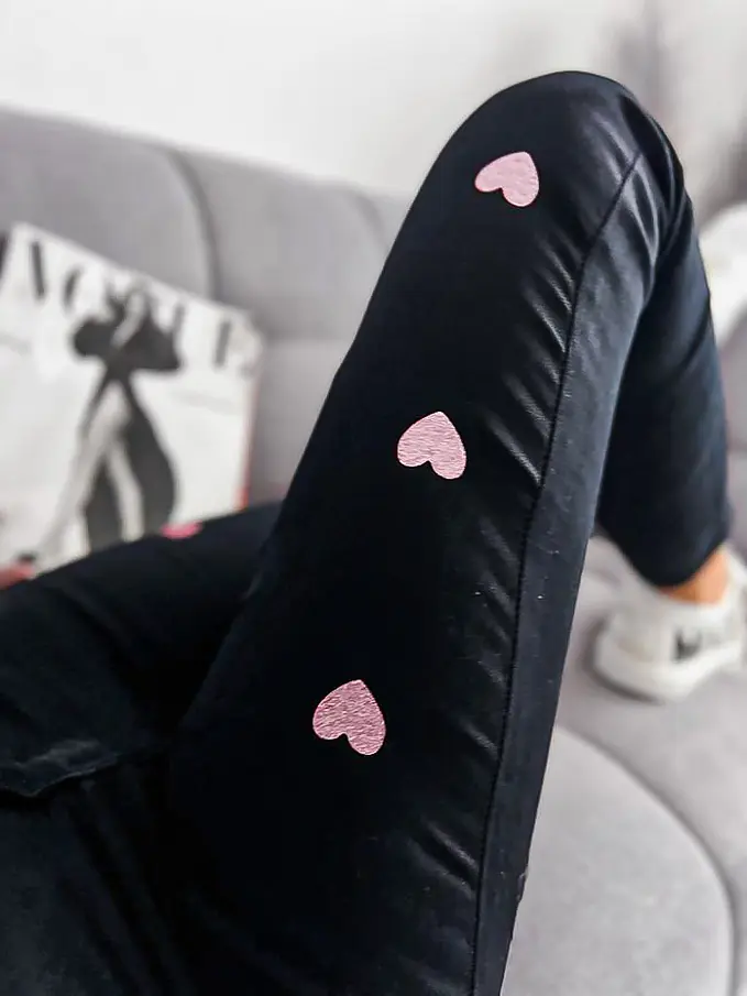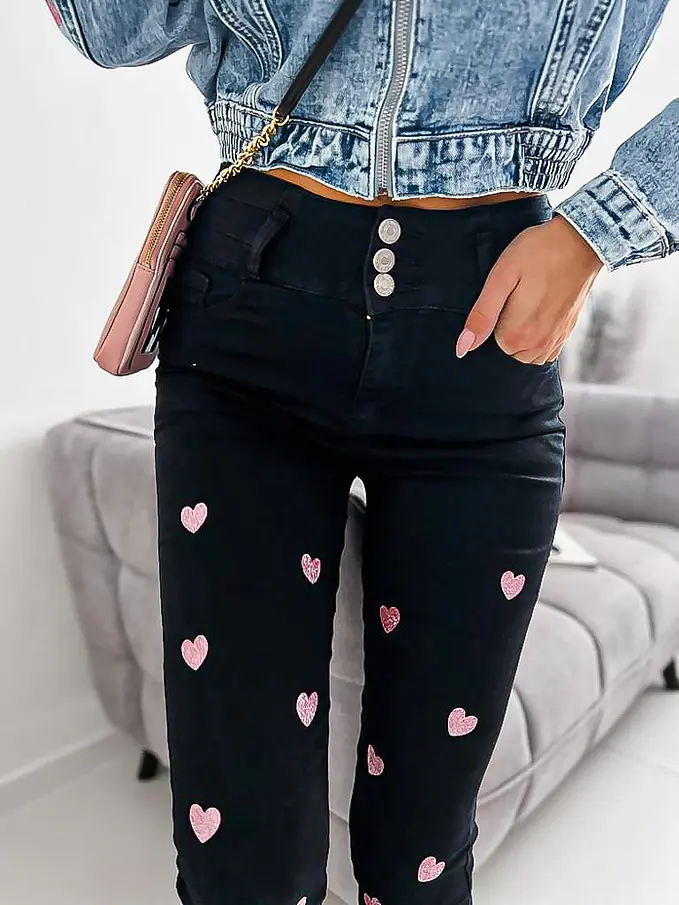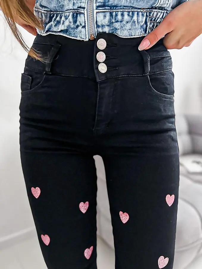 Vysoko pásové čierne rifle zdobené so srdiečkami