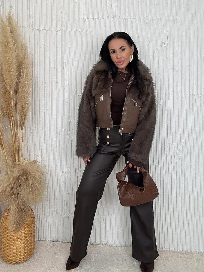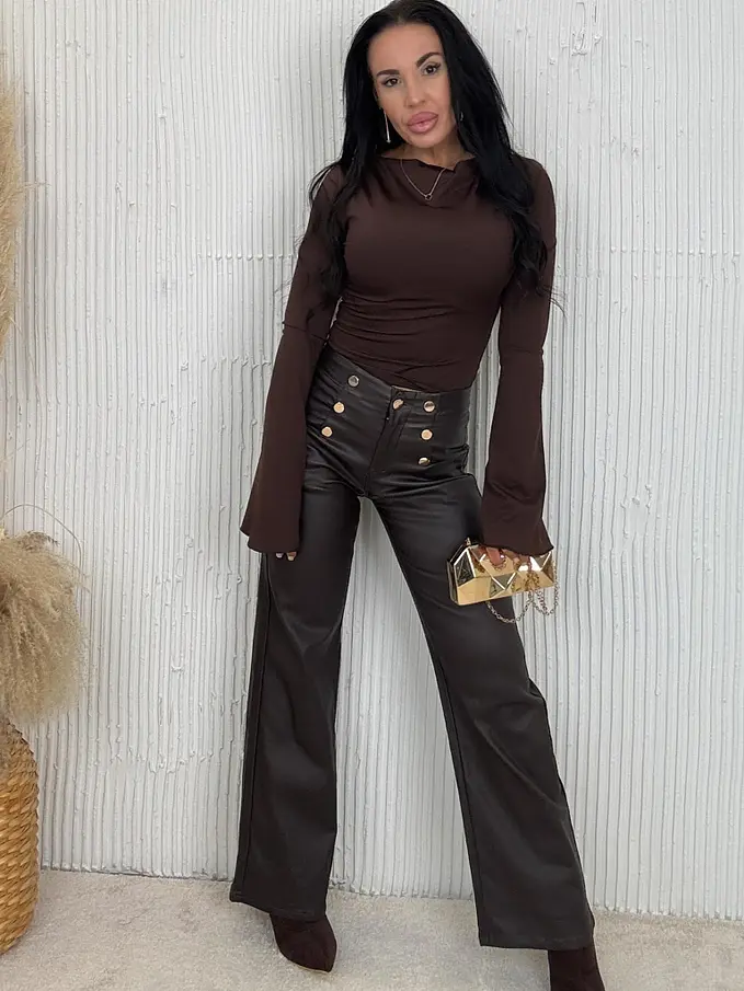 Vysoko-pásové koženkové wide-leg nohavice so zlatými gombíkmi+