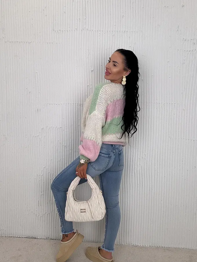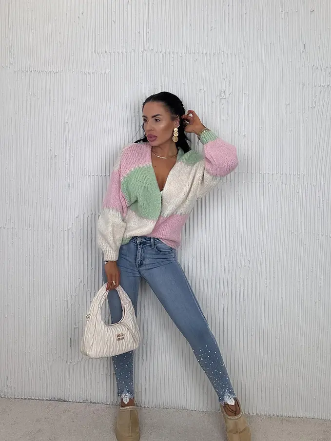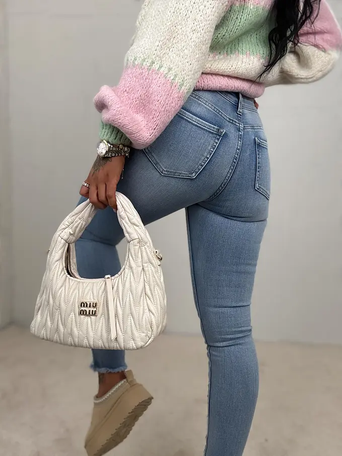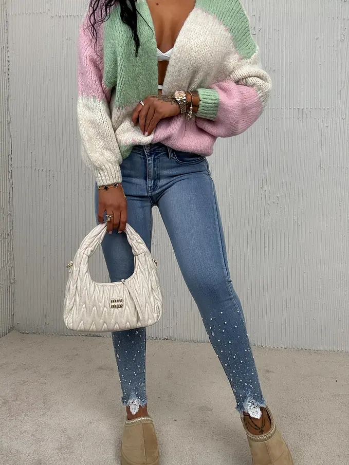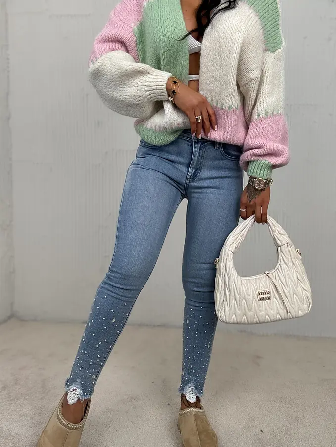 Vysoko-pásové skinny rifle zdobené kamienkami a korálikmi