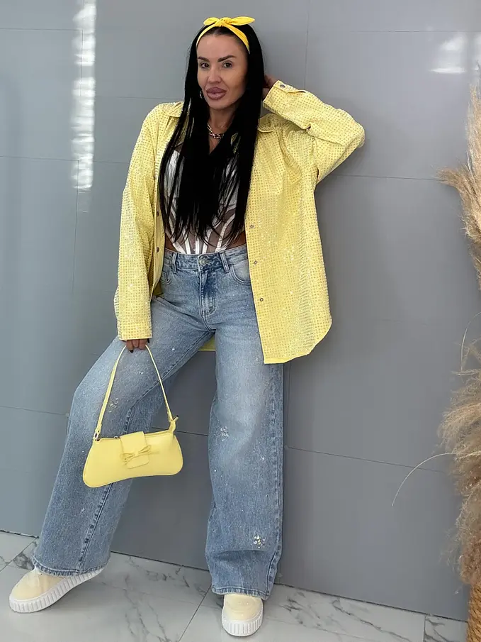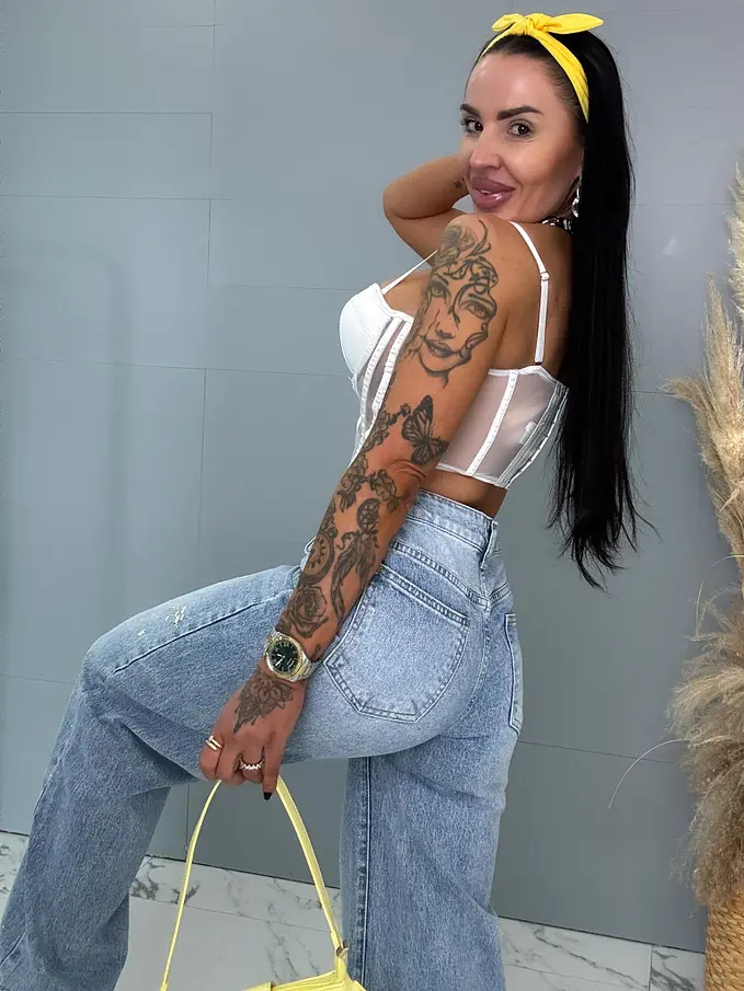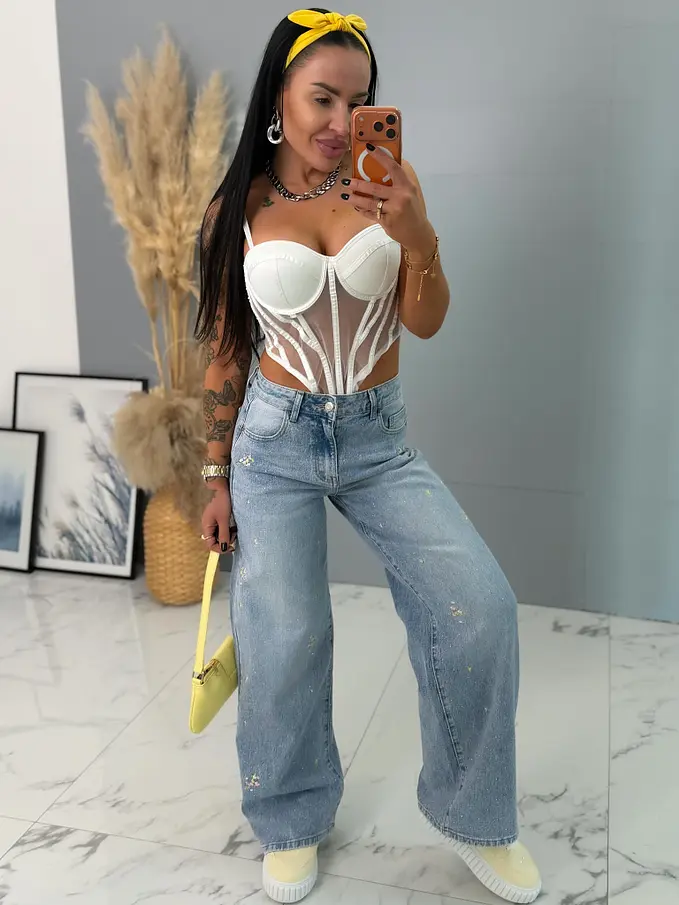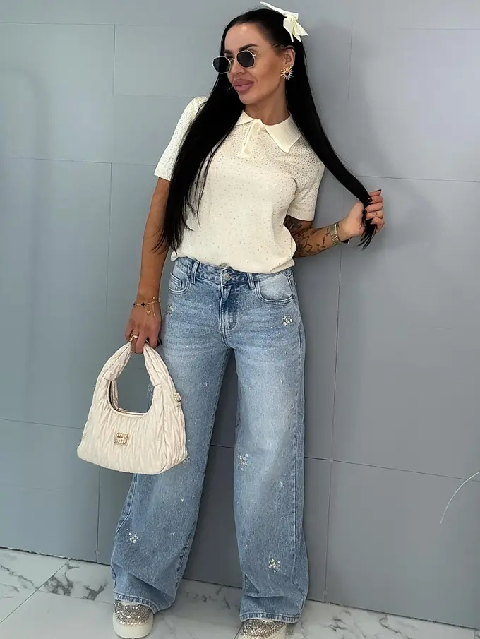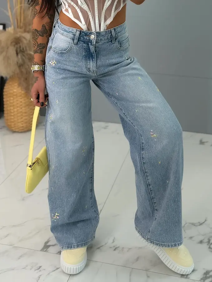 Vysokopásové vyšívané wide leg rifle s kamienkami