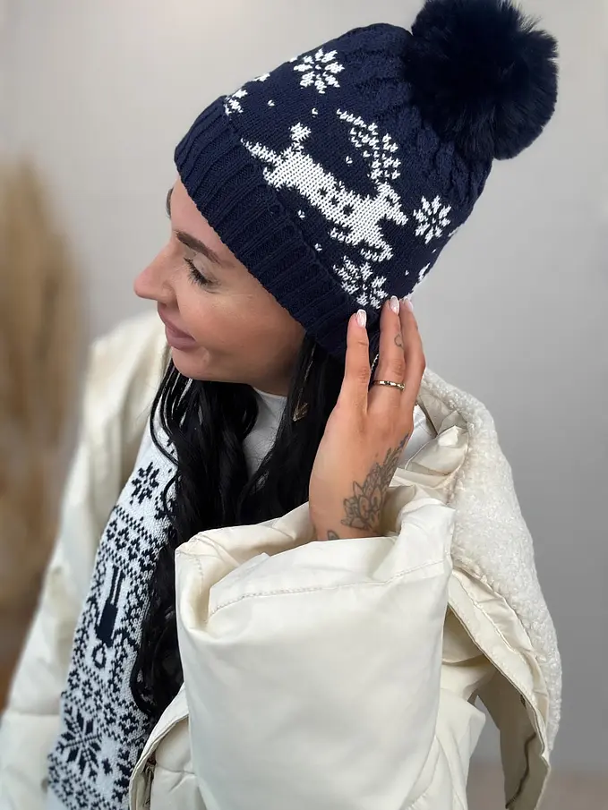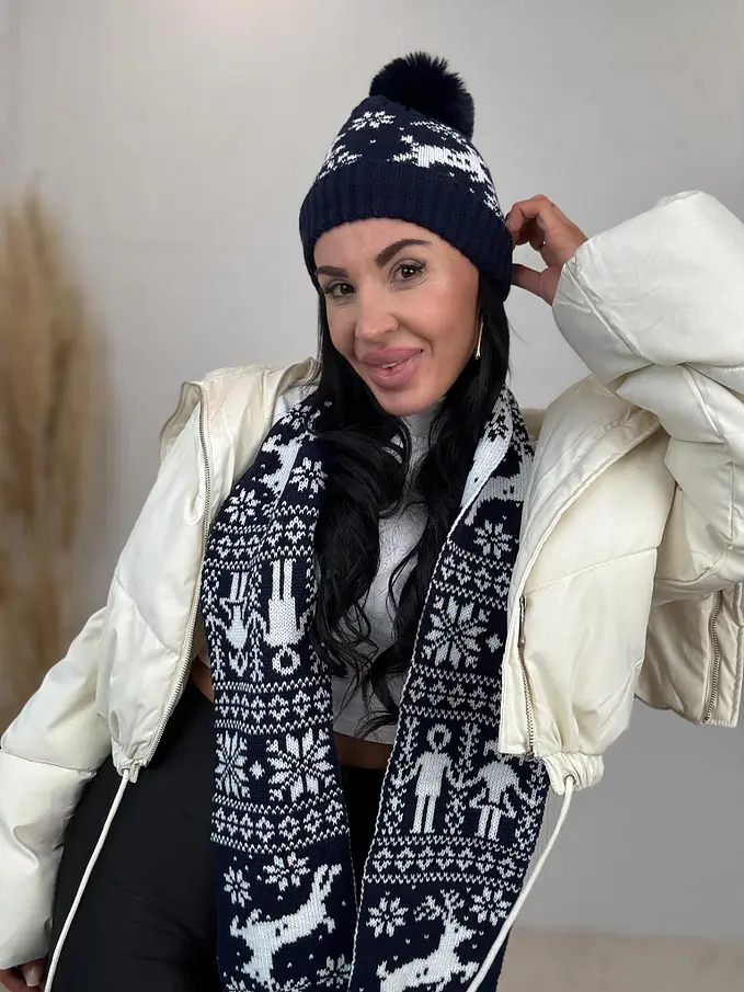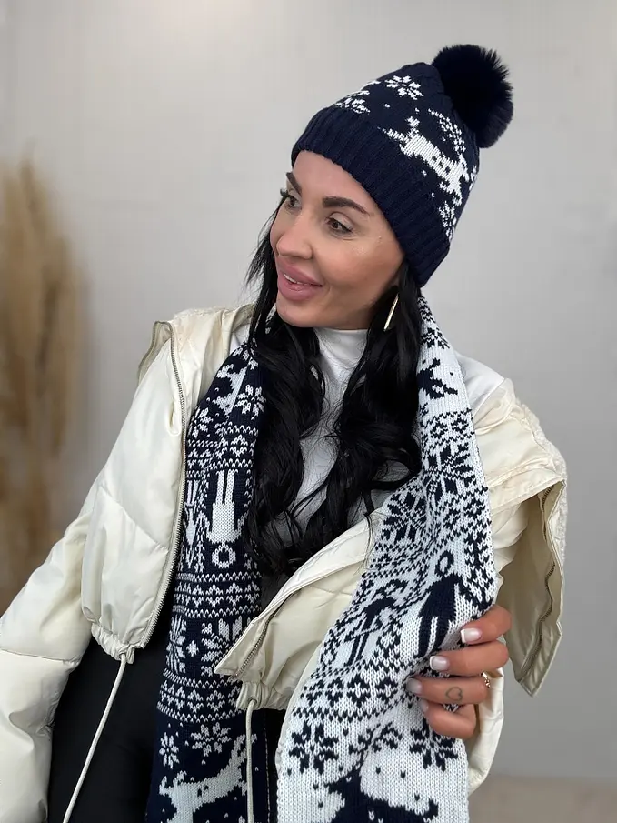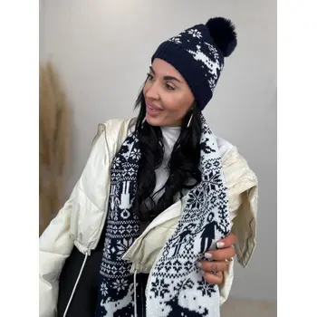 Vzorovaná teplá čiapka s brmbolcom a šálom