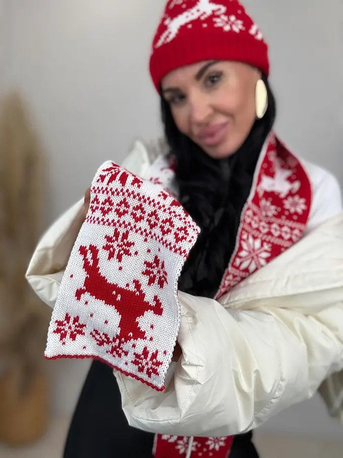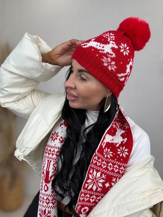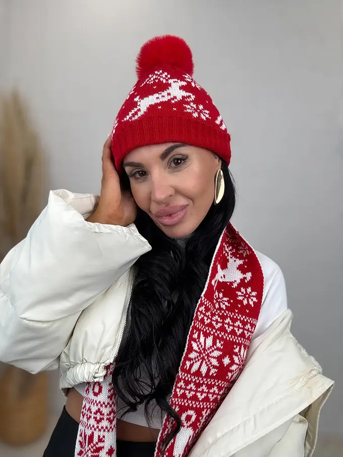 Vzorovaná teplá čiapka s brmbolcom a šálom