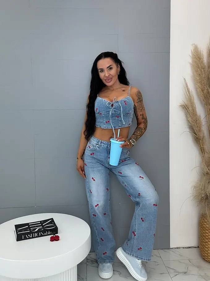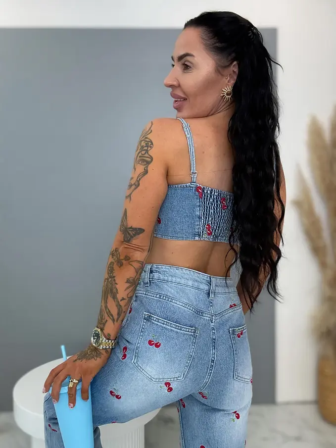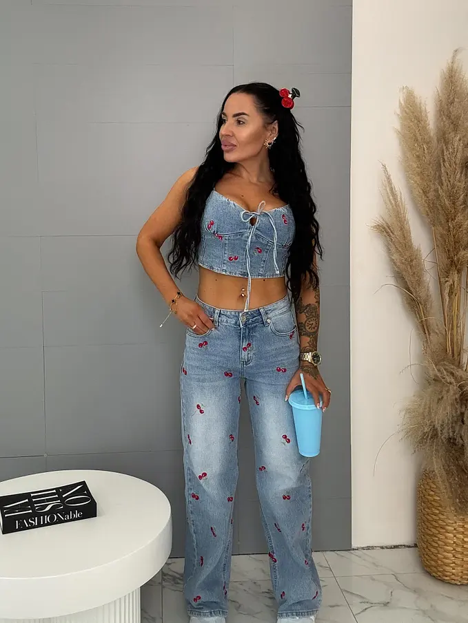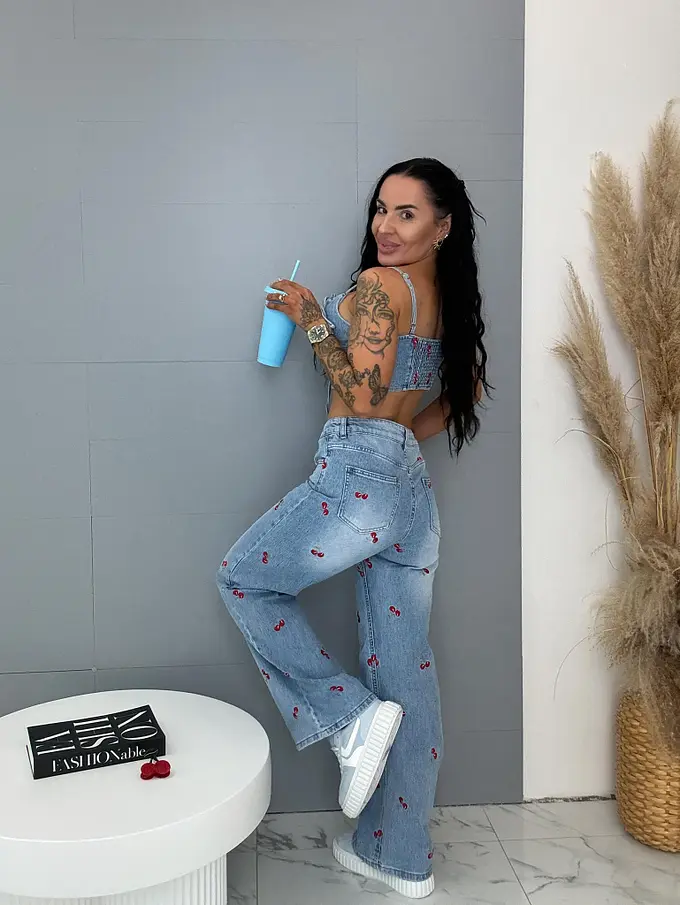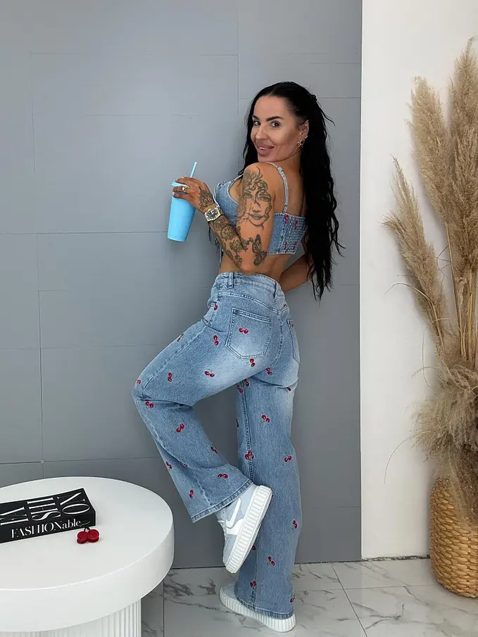 Wid leg rifle s vysokým pásom zdobené s čerešňovou výšivkou