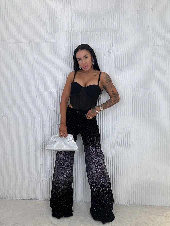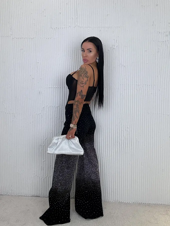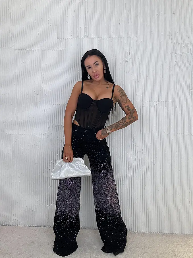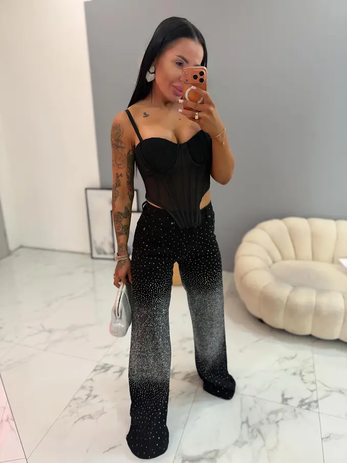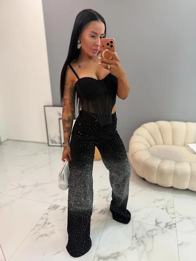 Premium kvalita. Nohavice majú vysoký pás. Materiál je príjemný, a mierne elastický. Jemné kamienky po celej ploche.