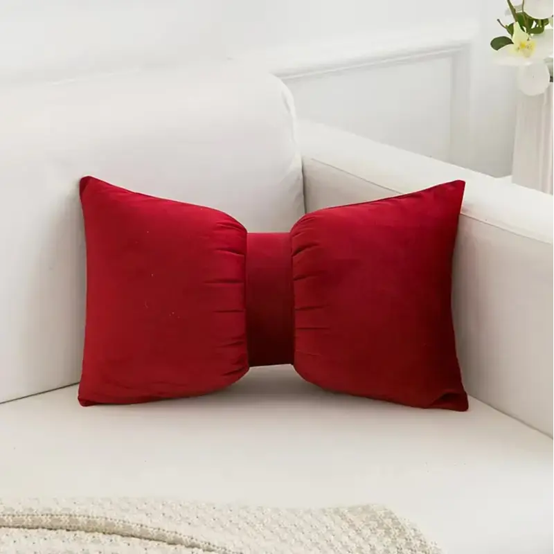 Zamatový dekoratívny vankúš s červenou mašľou.