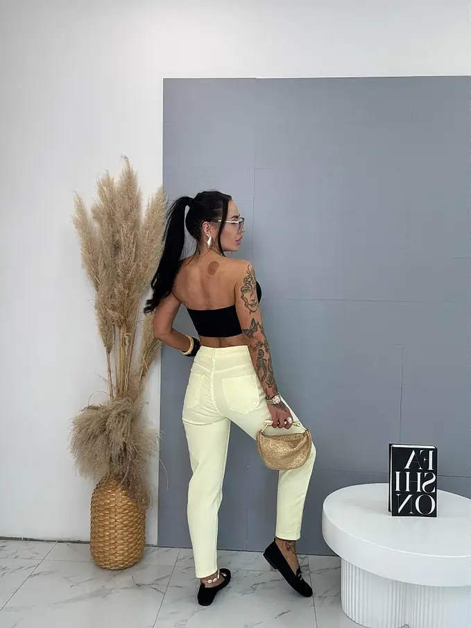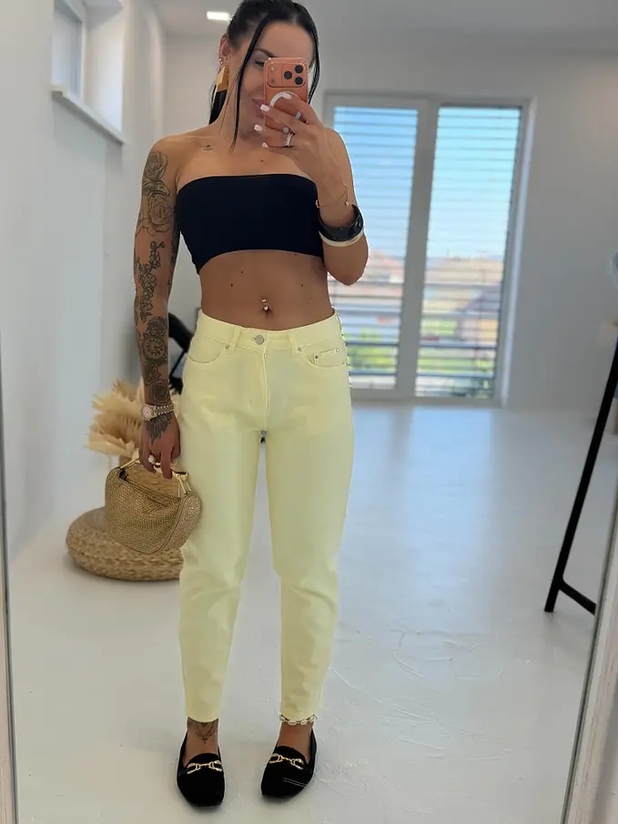 Žlté elastické mom fit rifle s vysokým pásom DAPHNE